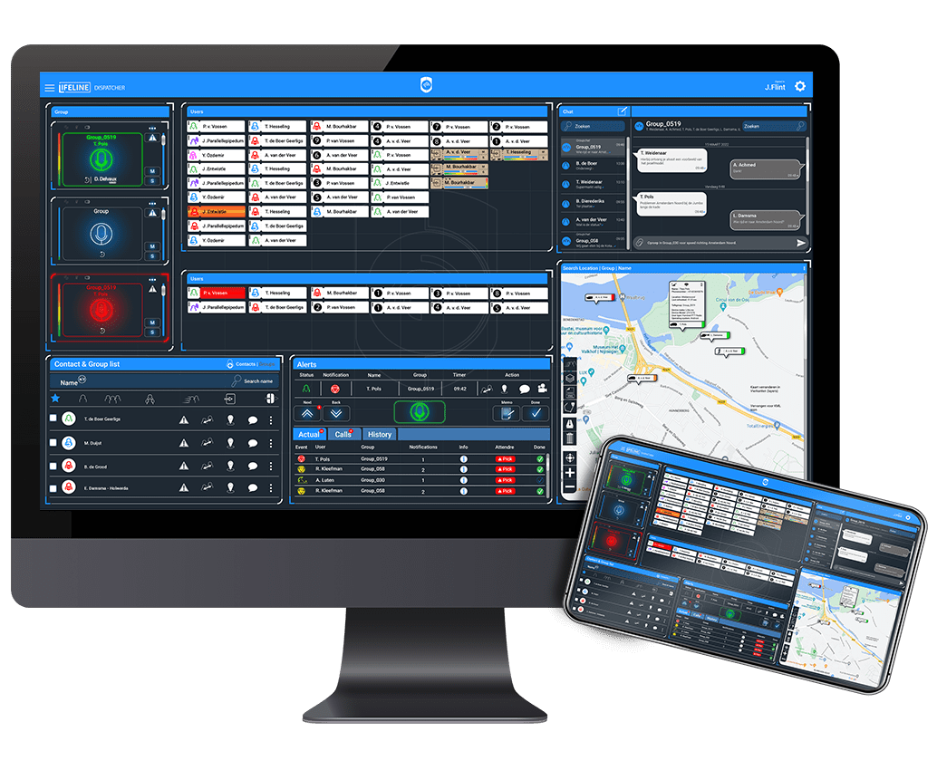The browser driven dispatcher is the hub around which all other functionality revolves. Clearly visible at a glance, the dispatcher displays all users and groups of users, together with their current status. It successfully links individuals and groups, allows control over alerts and accessories, which in turn supports operational success.