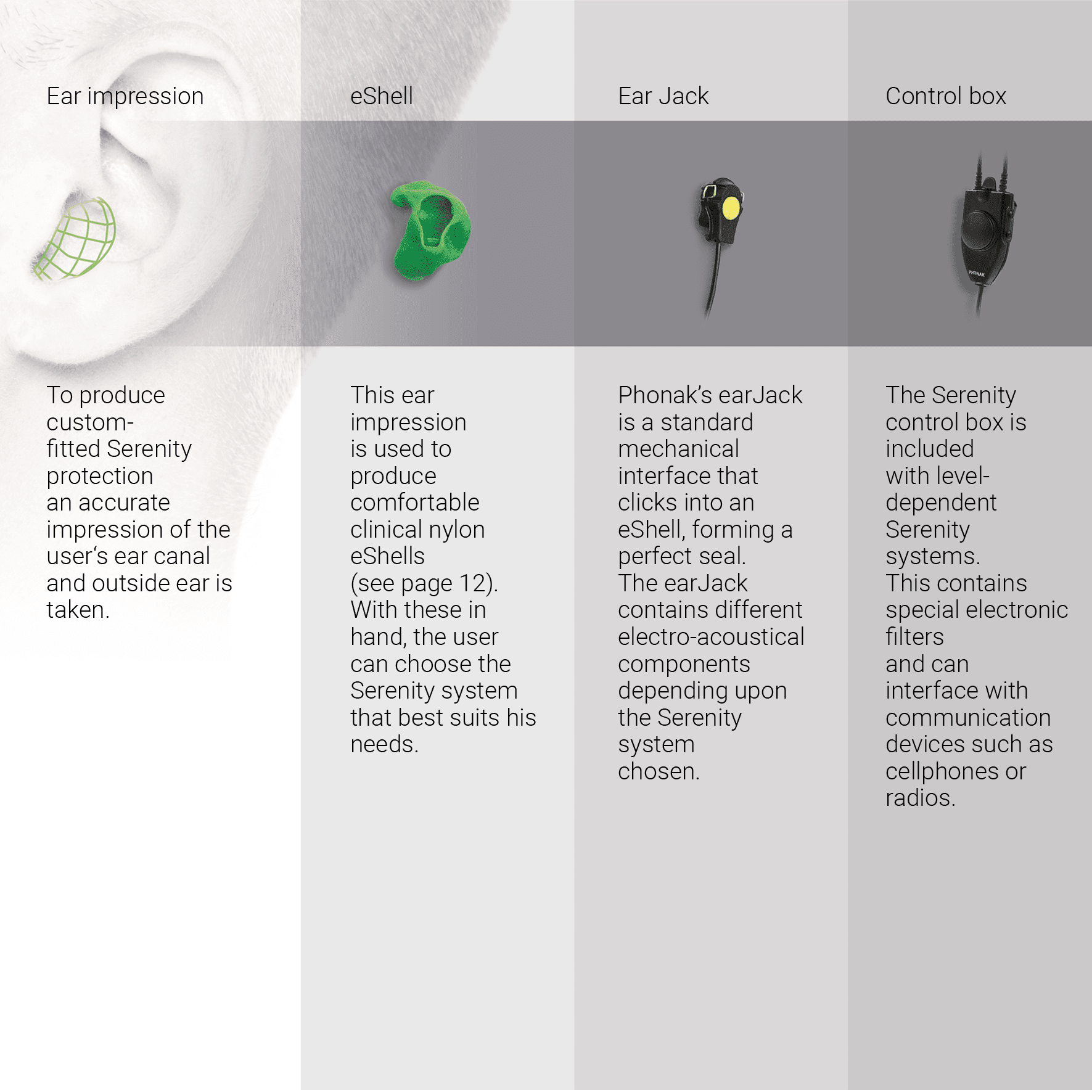 Phonak’s earJack is a standard mechanical interface that clicks into an eShell, forming a perfect seal. The earJack contains different electro-acoustical components depending upon the Serenity system chosen.